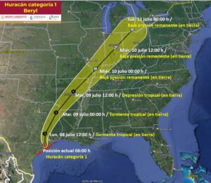 Situación Actual: El centro del huracán Beryl, categoría 1 en la escala Saffir-Simpson, se desplaza hacia el norte en tierra sobre...