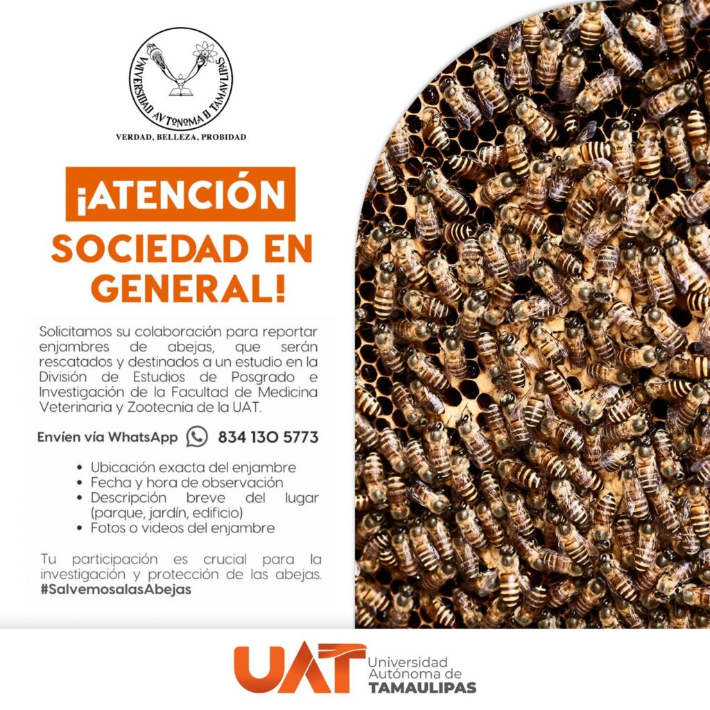 . Si ves un enjambre, repórtalo a la comunidad científica de nuestra Facultad de Medicina Veterinaria y Zootecnia de la UAT. Queremos rescatarlo para estudios y luego reubicarlo en la naturaleza.