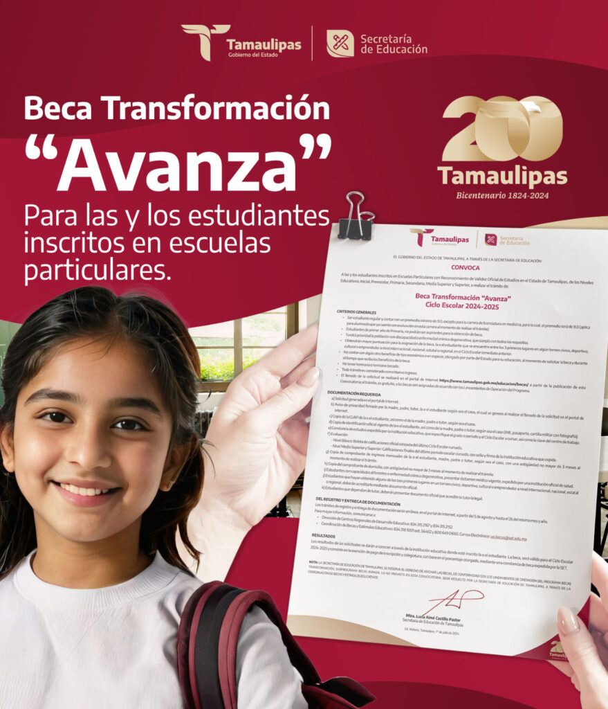 El Gobierno del Estado de Tamaulipas a través de la Secretaría de Educación de Tamaulipas, da a conocer la Convocatoria Beca Transformación “Avanza”, para el ciclo escolar 2024-2025, dirigida a las y los estudiantes inscritos en escuelas particulares con Reconocimiento de Validez Oficial de Estudios en el Estado.