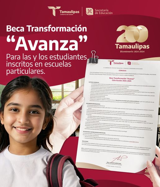 El Gobierno del Estado de Tamaulipas a través de la Secretaría de Educación de Tamaulipas, invita a realizar el trámite de Beca Transformación “Avanza”, para el ciclo escolar 2024-2025, dirigida a estudiantes inscritos en escuelas particulares con Reconocimiento de Validez Oficial de Estudios en el Estado.
