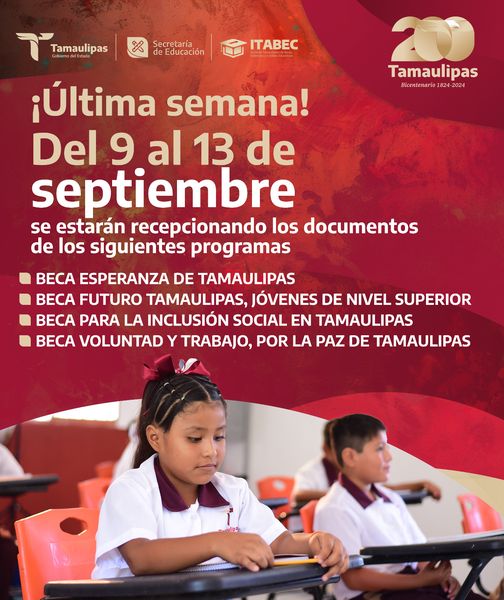 Del 9 al 13 de septiembre, es la última semana para realizar el trámite de las siguientes Becas, que el Gobierno del Estado de Tamaulipas a través de la Secretaría de Educación de Tamaulipas (SET) y el Instituto Tamaulipeco de Becas, Estímulos y Créditos Educativos (ITABEC), ponen a tu disposición, aplicando las políticas humanistas que fortalecen la igualdad de oportunidades para todas y todos en la entidad.
