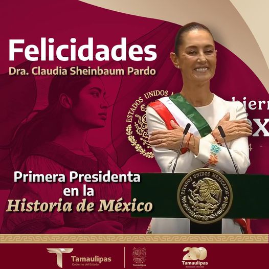 Hoy suenan campanas de libertad en México y se consolida la lucha histórica del humanismo mexicano. Con mucha alegría, felicitamos a la Dra. Claudia Sheinbaum Pardo por su toma de protesta como la primera mujer Presidenta de México, un hecho histórico que llena de esperanza a nuestra nación. Este momento reafirma que la transformación de este país está en marcha. Su liderazgo será fundamental para continuar con el segundo piso de la transformación. Desde Tamaulipas nos unimos a su visión de un país más justo, equitativo y próspero para todas y todos. Muchas felicidades Presidenta, con “a”, como usted bien lo dice.