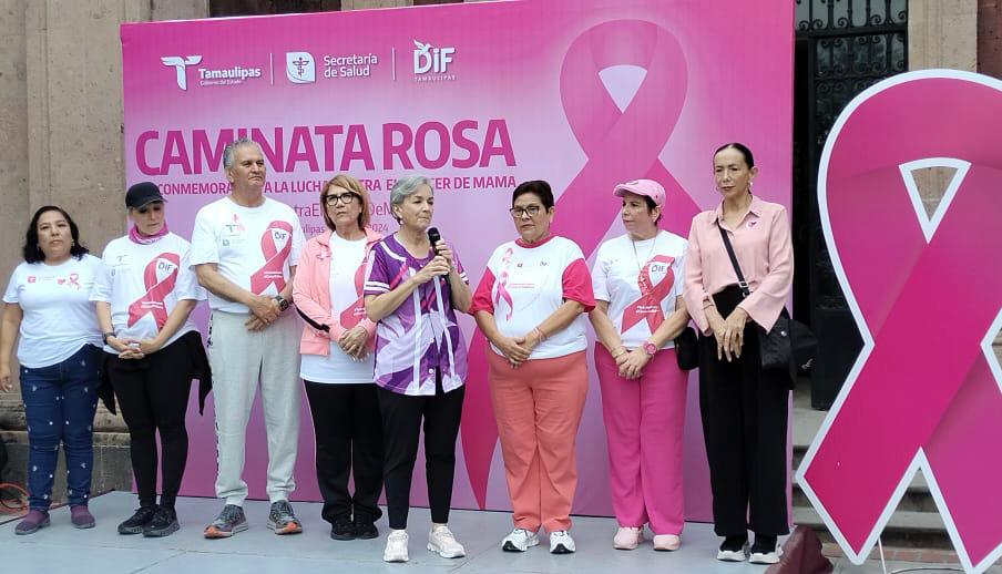 Ciudad Victoria, Tamaulipas.- Para conmemorar el Día Internacional de la Lucha contra el Cáncer de Mama, la doctora María Santiago de Villarreal, presidenta del Sistema DIF Tamaulipas, en compañía por el secretario de Salud, Vicente Joel Hernández Navarro, dio el banderazo de salida de la “Caminata Rosa” con la cual se busca concientizar a mujeres y hombres sobre lo importante que es la prevención y la detección oportuna de este padecimiento.