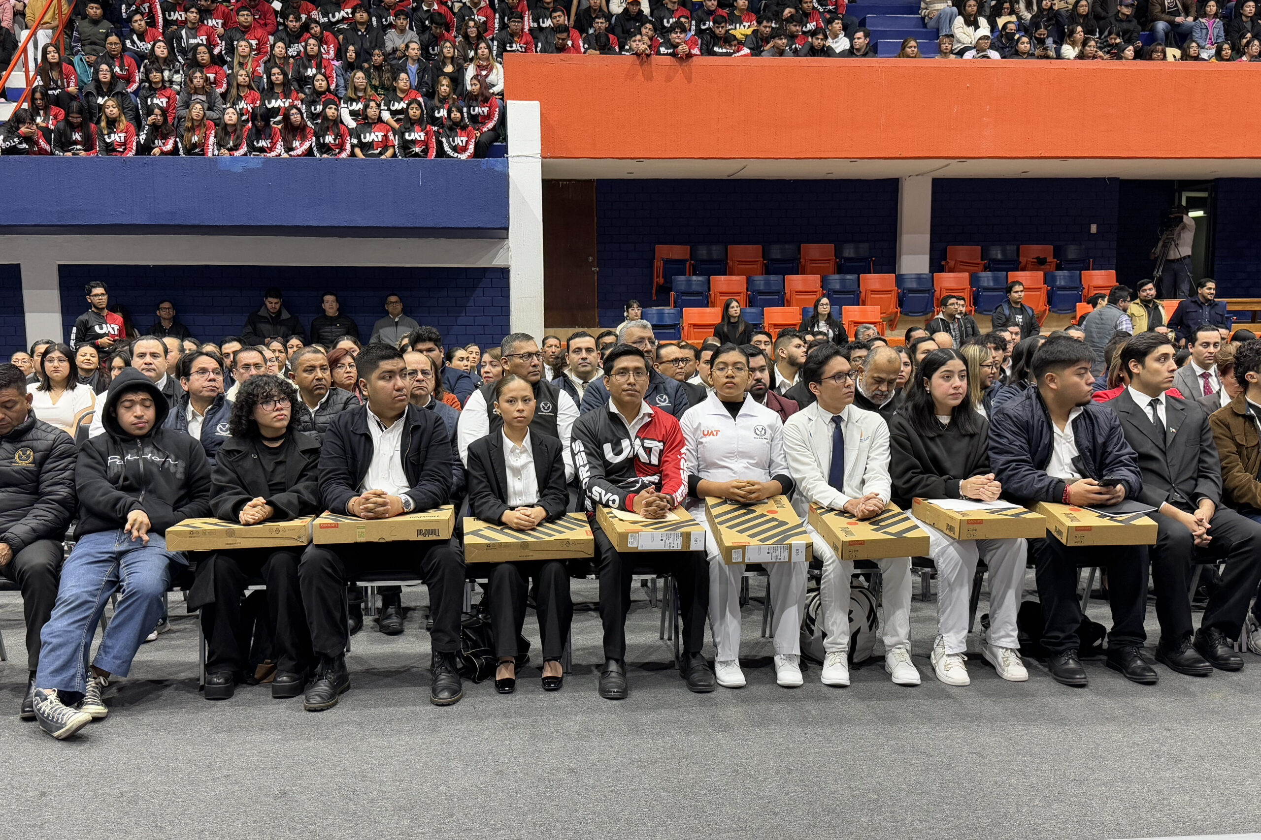 y unidades académicas, donde hizo entrega de equipo de cómputo portátil a estudiantes