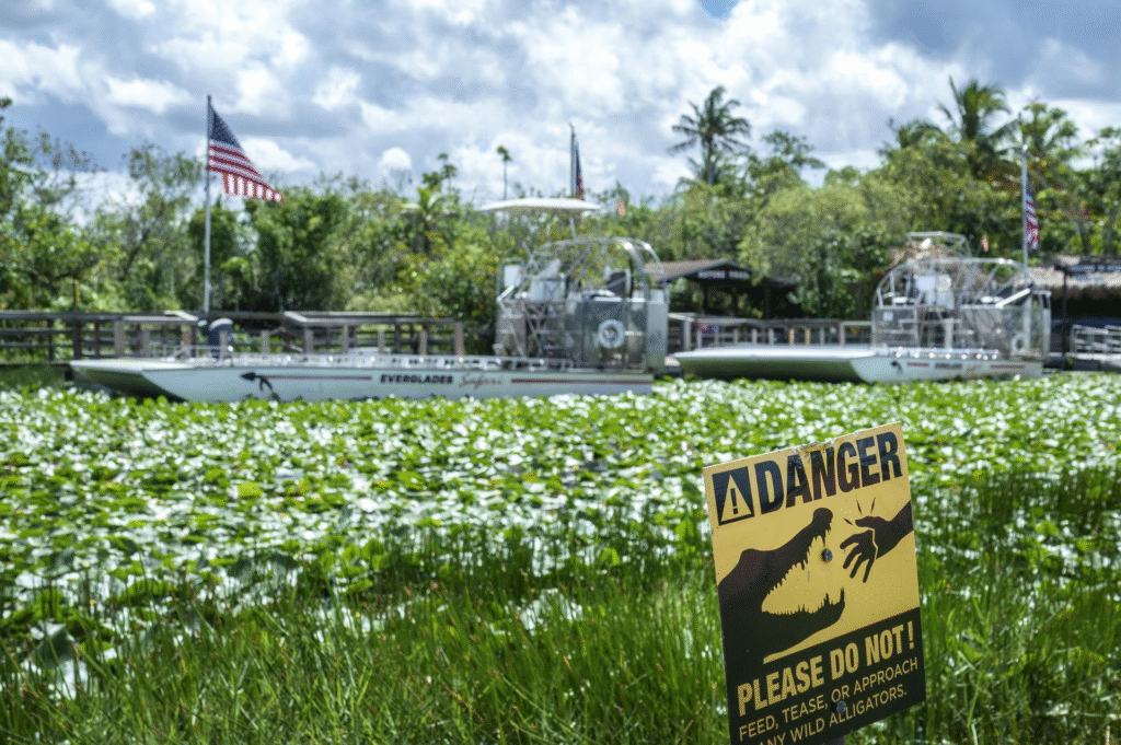 Un cartel que advierte sobre animales peligrosos en el Parque Nacional Everglades, cerca de Miami, Florida, EE.UU., el 12 de agosto de 2025. EFE/EPA/Cristobal Herrera-Ulashkevich